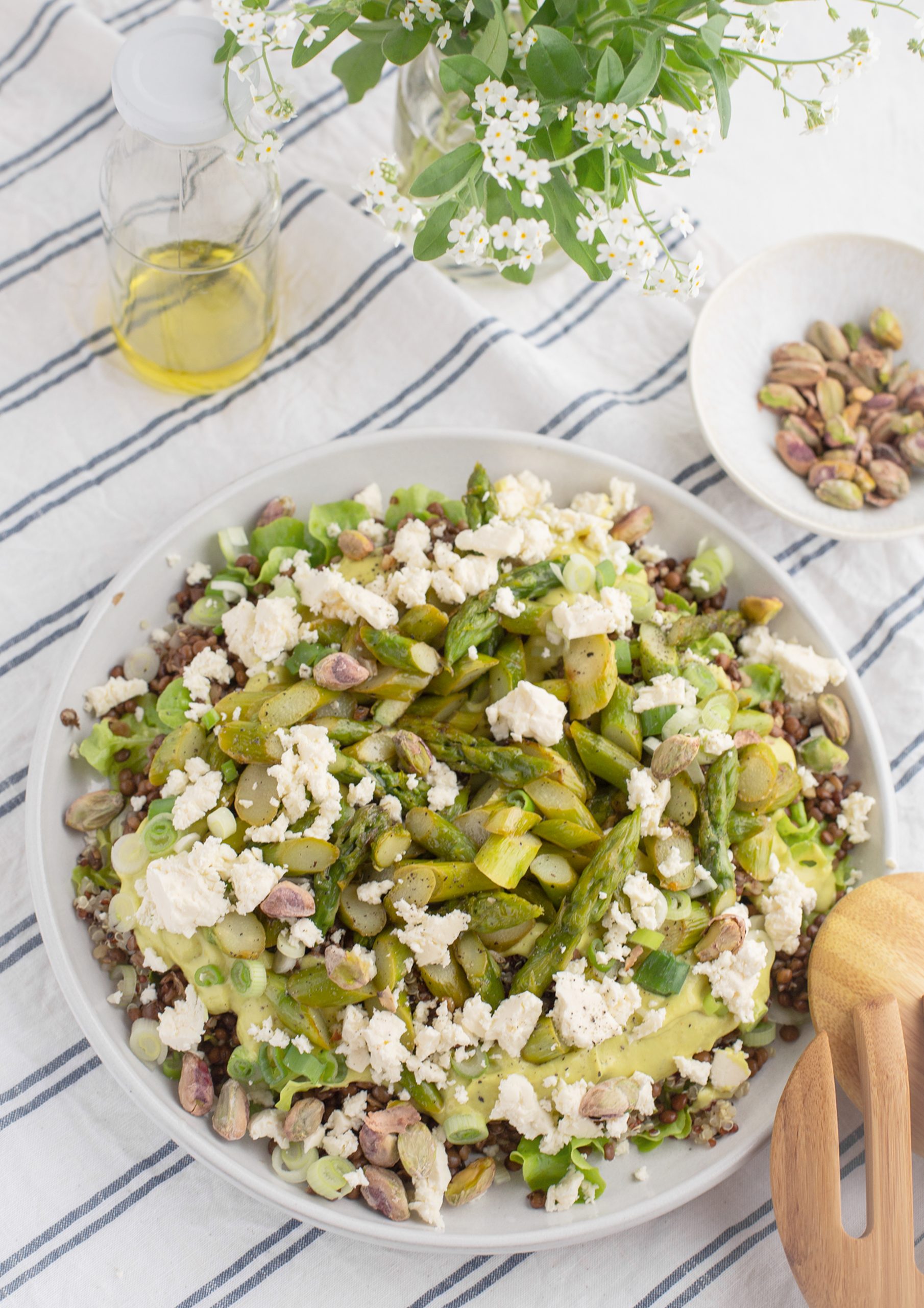 Die knackigen Pistazien, leckerer Feta und Frühlingszwiebeln sind ein tolles Topping. Etwas frischen Zitronensaft und Pfeffer zum Schluss darüber und fertig ist ein sooooo leckerer Salat.