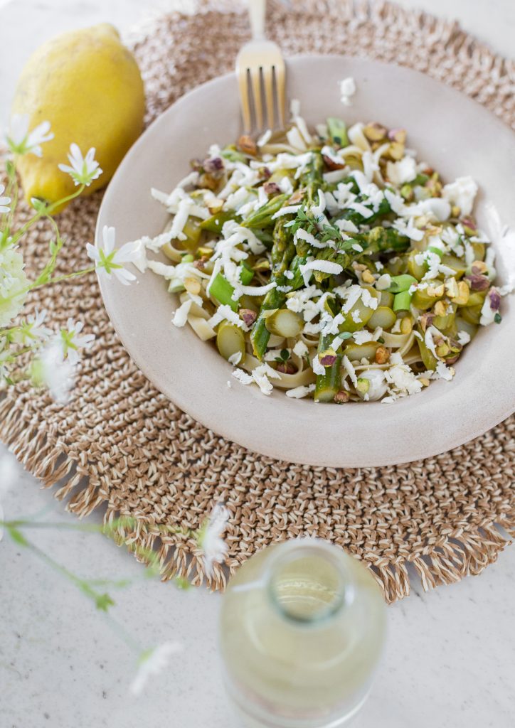 Die Kombination aus Tagliatelle, grüner Spargel in Zitronen Butter Soße und Zitronenthymian ist so lecker. On top kommen noch etwas Olivenöl, Frühlingszwiebeln, Feta, Pistazien und etwas Zitronenthymian.