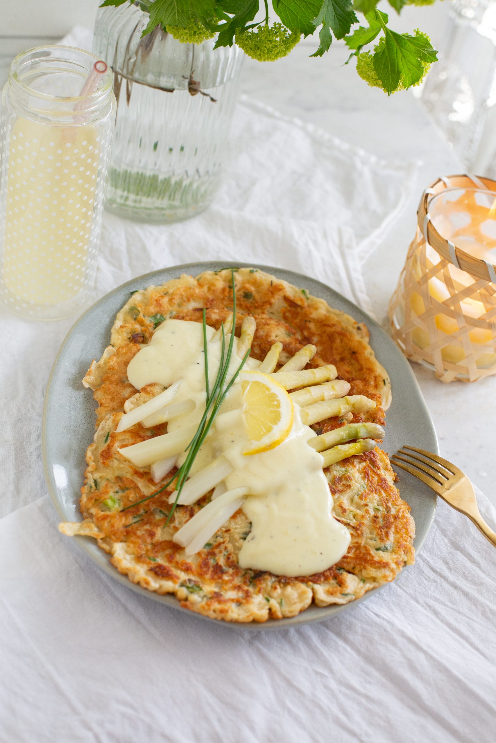 Kräuter – Käse – Pfannkuchen mit weißen Spargelspitzen