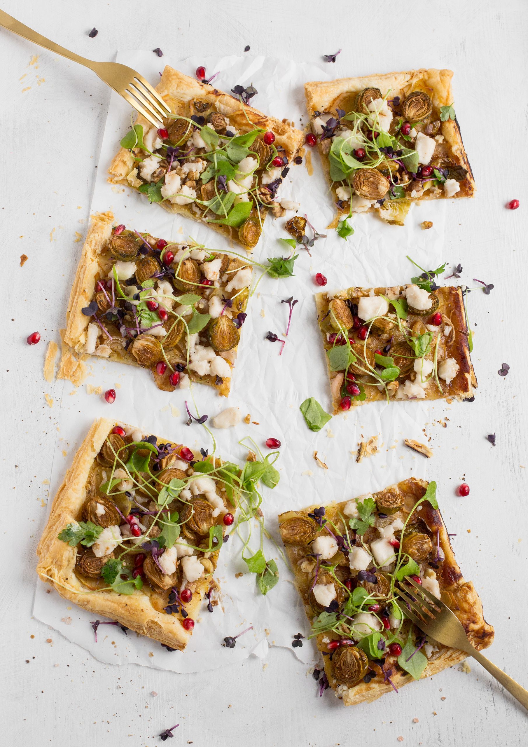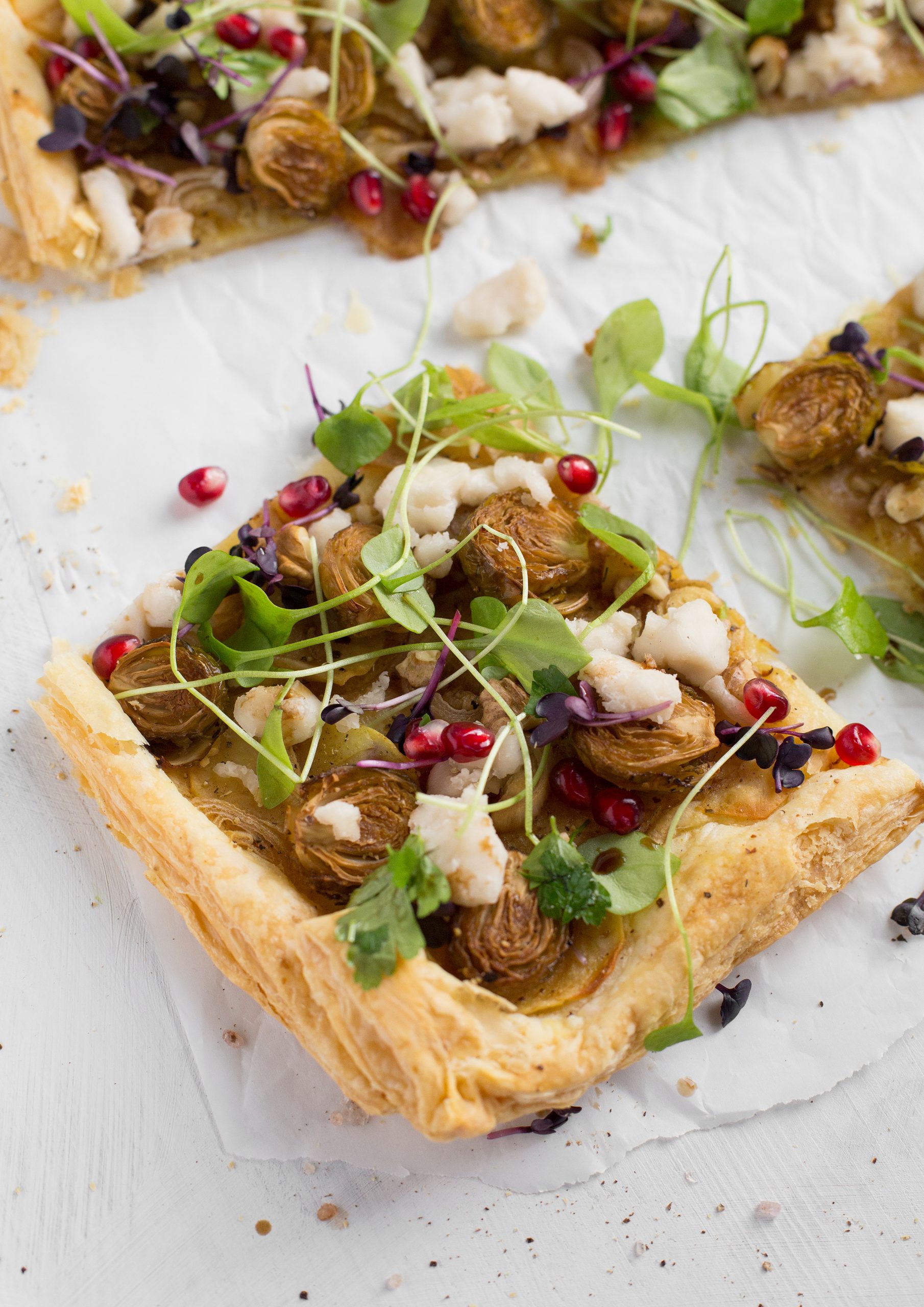 Die Blätterteigpizza mit fein gehobelten Kartoffeln und Rosenkohl in Honig und Balsamico mariniert ist ein ganz wundervolles Winterrezept. Mit Postelein, Radieschenkresse, glatter Petersilie und Granatpfelkernen getoppt bietet es eine schöne Farbexplosion auf dem Esstisch beim oft nebligen Novemberwetter.