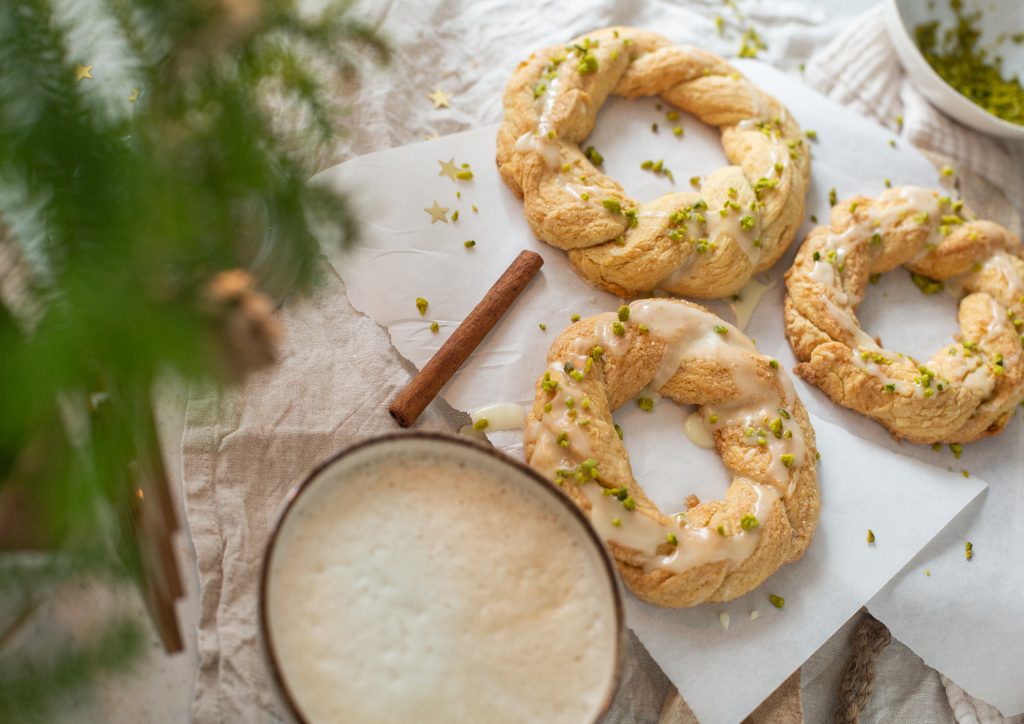 Die Flachswickelkränze sind so lecker, haben einen knusprigen Boden, sind buttrig und vielschichtig und die Glasur aus Puderzucker und Orangensaft passt super dazu. Etwas kleingehackte Pistazien on top lassen es wie kleine Kränze aussehen.