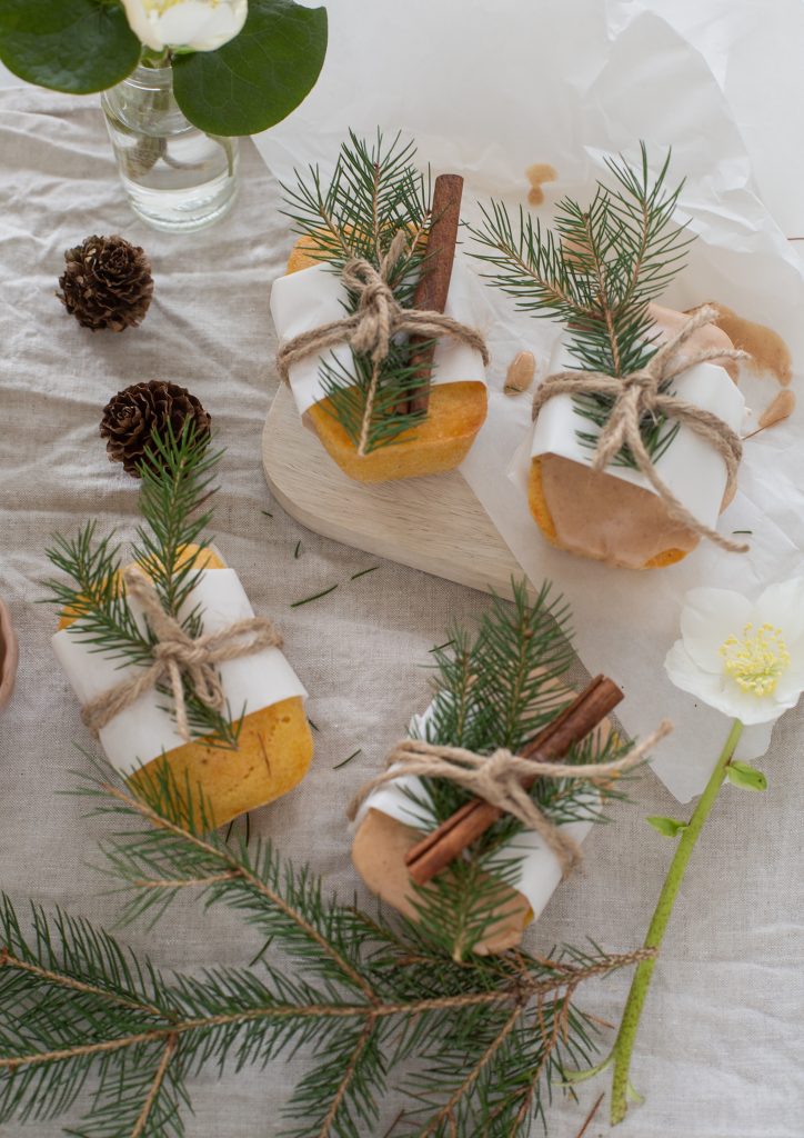 Die Rübliküchlein mit Lebkuchenglasur sind auch ein sehr schönes Mitbringsel und in etwas Butterbrotpapier gepackt und mit einem Zweig und wer mag mit einer Zimststange dekoriert, sind sie so goldig und werden die Augen zum Strahlen bringen.