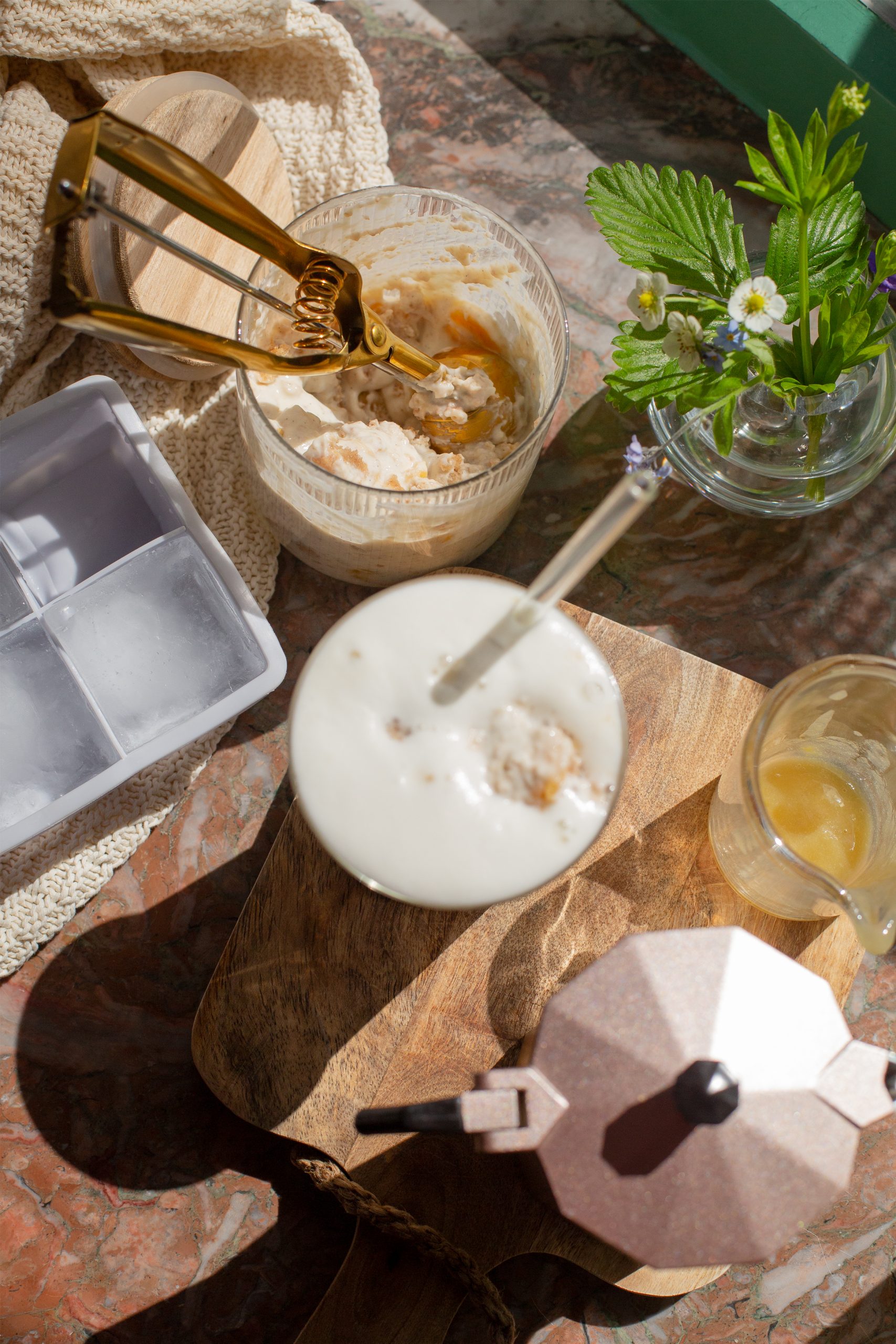 3. In ein großes Glas den Eiswürfel geben, darüber den Bananensirup geben. Espresso darüber gießen und mit dem kalt aufgeschäumten Haferdrink Vanille knapp auffüllen. On top 2 Scoops vom Banana Bread Topping geben.