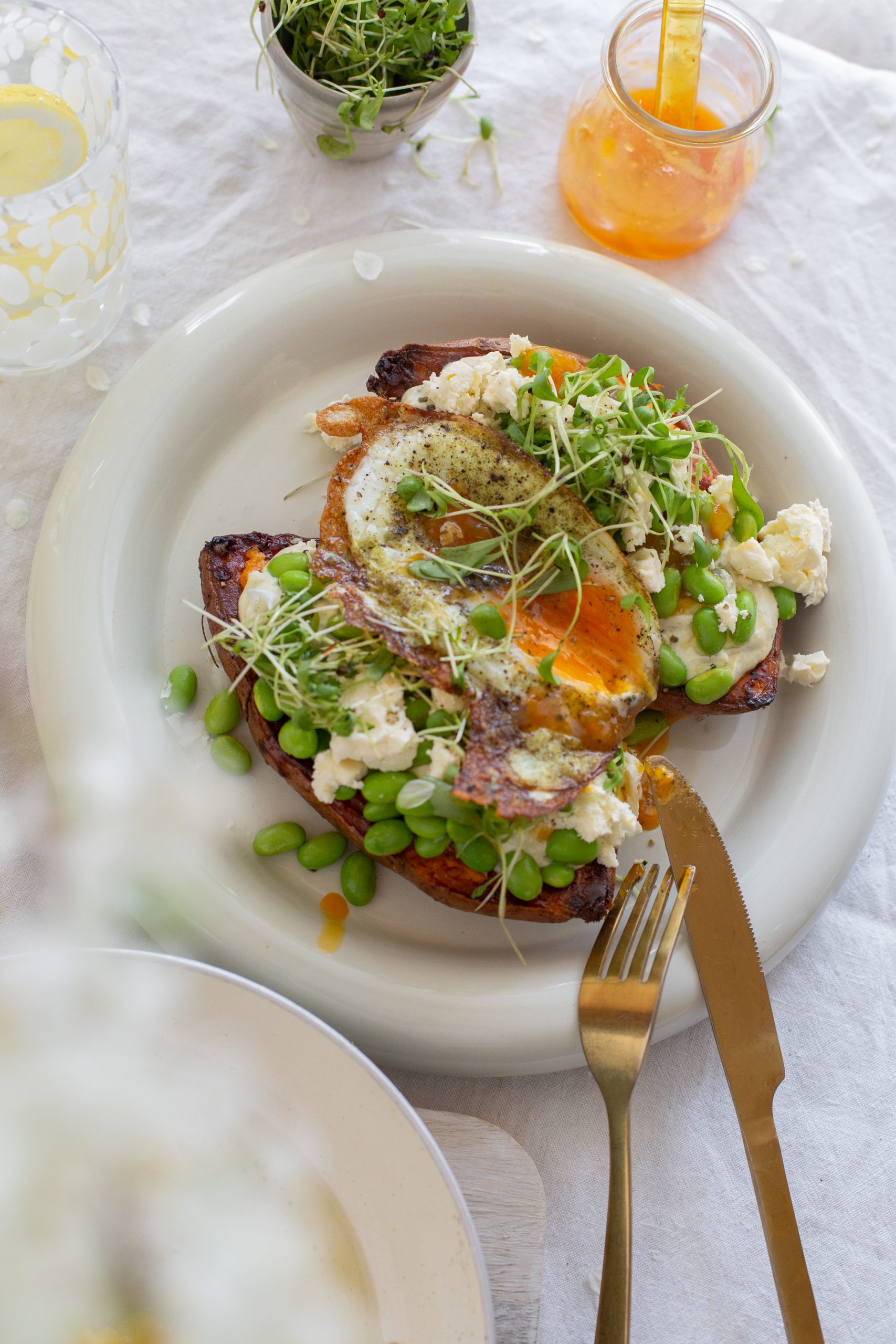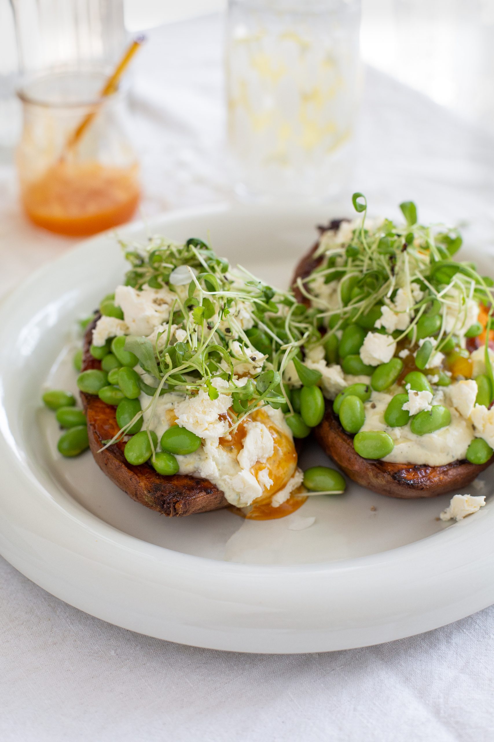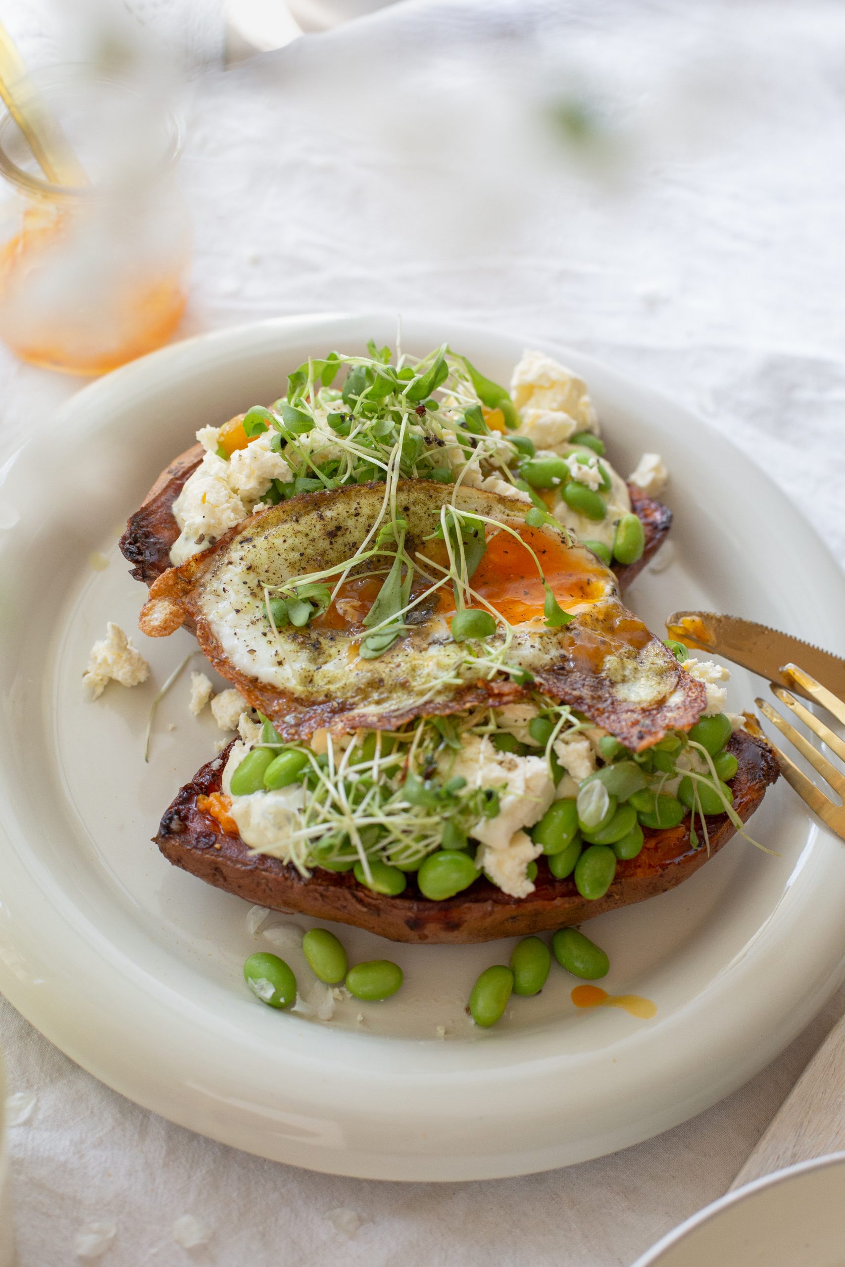 5. Die Süßkartoffelhälften auf einen großen Teller geben, mIt einer Gabel leicht eindrücken. Etwas Feta/Hirtenkäse darüber krümeln und leicht einarbeiten. Sour Cream Creme darauf geben. Darauf die Edamame geben. On top Sweet Cili Sauce geben, wieder etwas Feta/Hirtenkäse darüber krümeln und Kresse darauf streuen. Jetzt das Spiegelei darauf setzen und wer mag hier nochmal etwas von der Sweet Chili Sauce darauf geben.