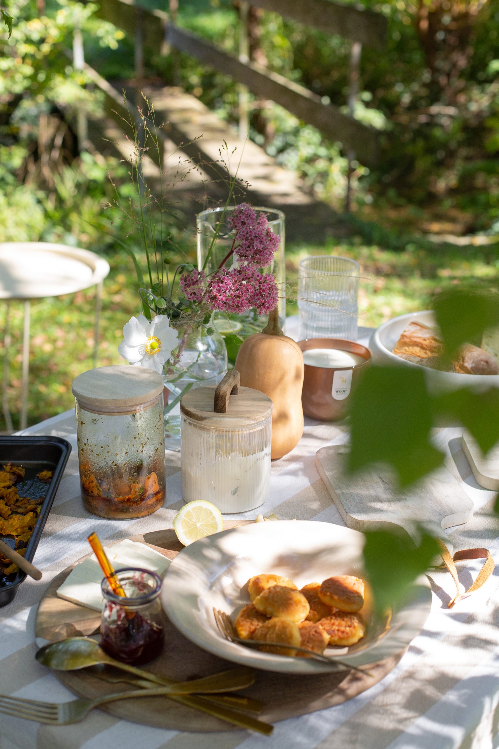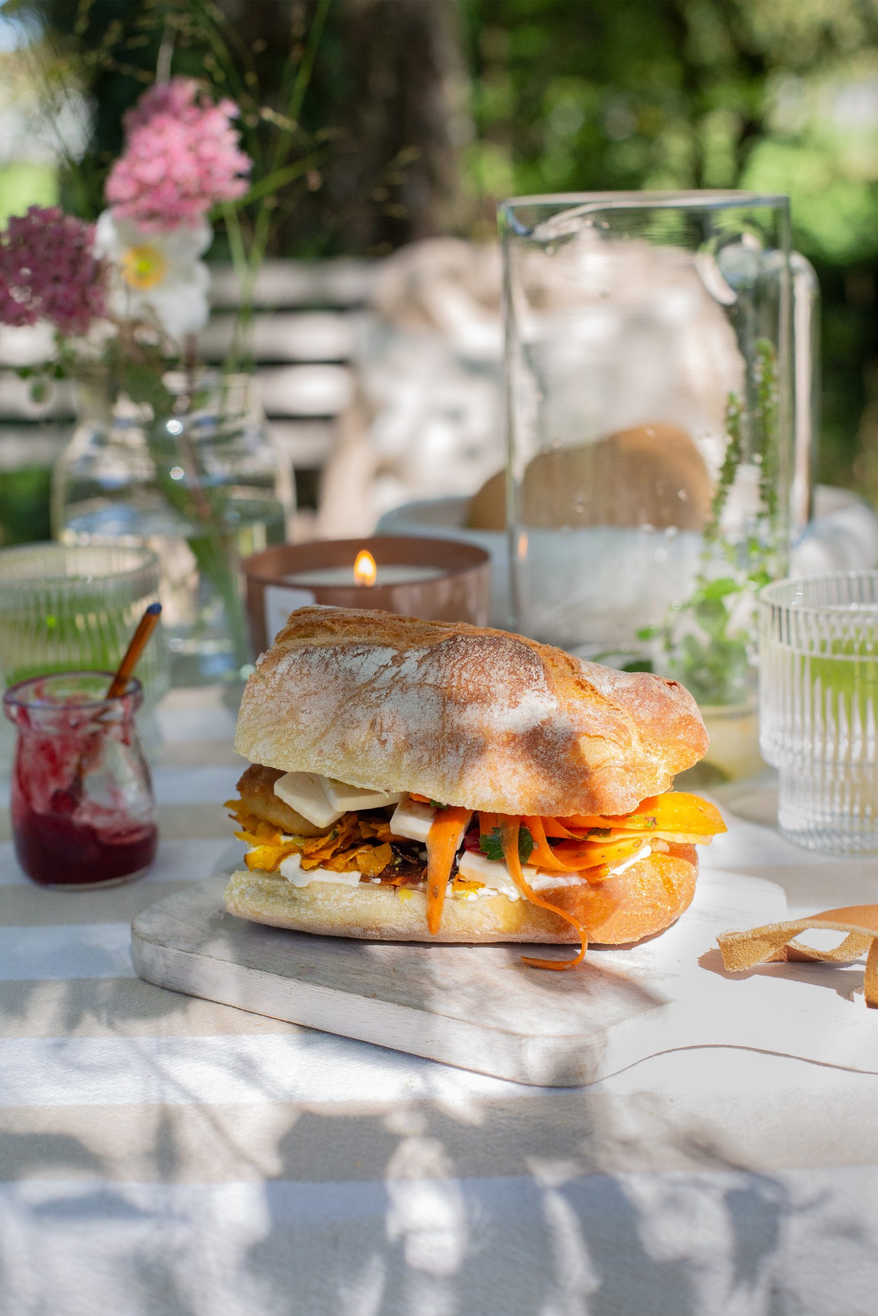 Am Tag als ich auf dem Markt war und das Baguette aus Maismehl gekauft habe und sich Stück für Stück die Idee zu diesem Sandwich gebildet hat, war es ein so schöner Septembertag, das ich unbedingt nochmal im Garten fotografieren und filmen wollte.