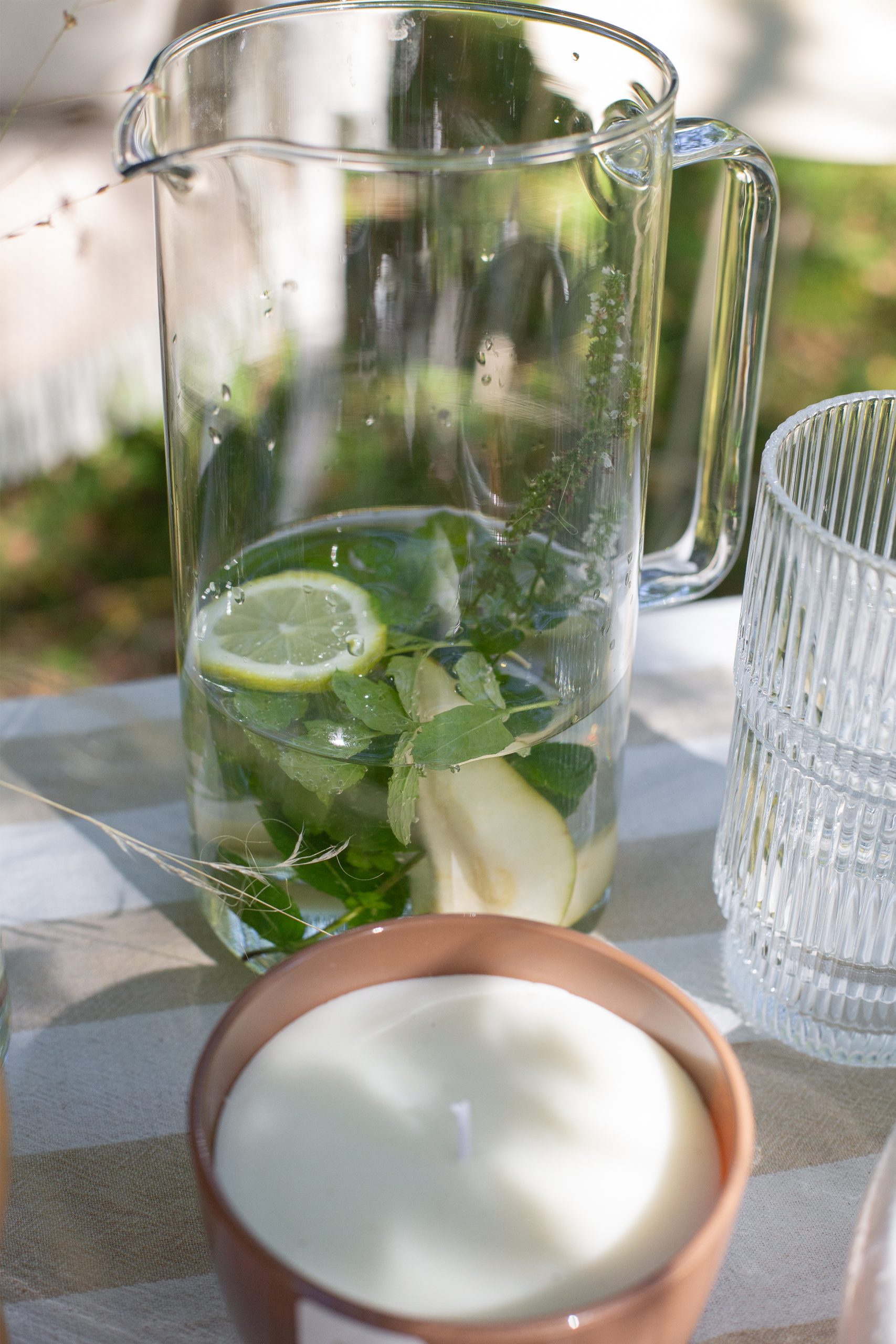 Dazu passt hervorragend ein Wasser mit Holunderblütensirup, etwas Minze, Zitronenscheiben und ein paar Birnenscheiben, wenn es etwas durchzieht können sich die Aromen gut entfalten.