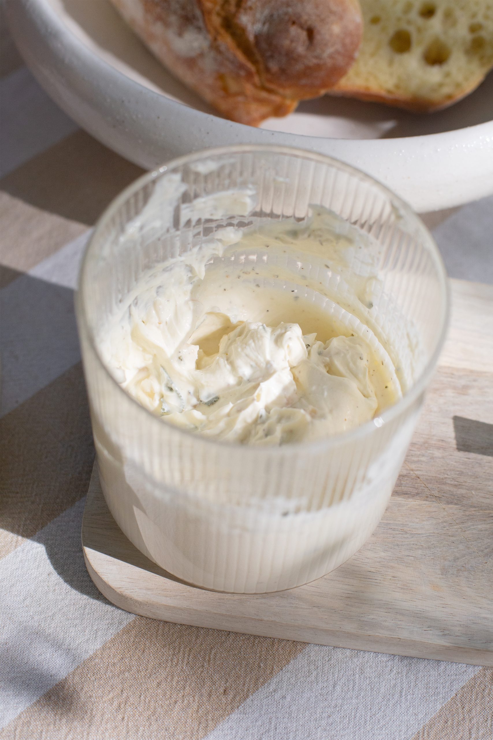 4. Alle Zutaten für den Frischkäse in ein Gefäß geben und mit einer Gabel oder Schneebesen cremig verrühren. So kann der übrige Frischkäse später auch gut im Kühlschrank aufbewahrt werden.