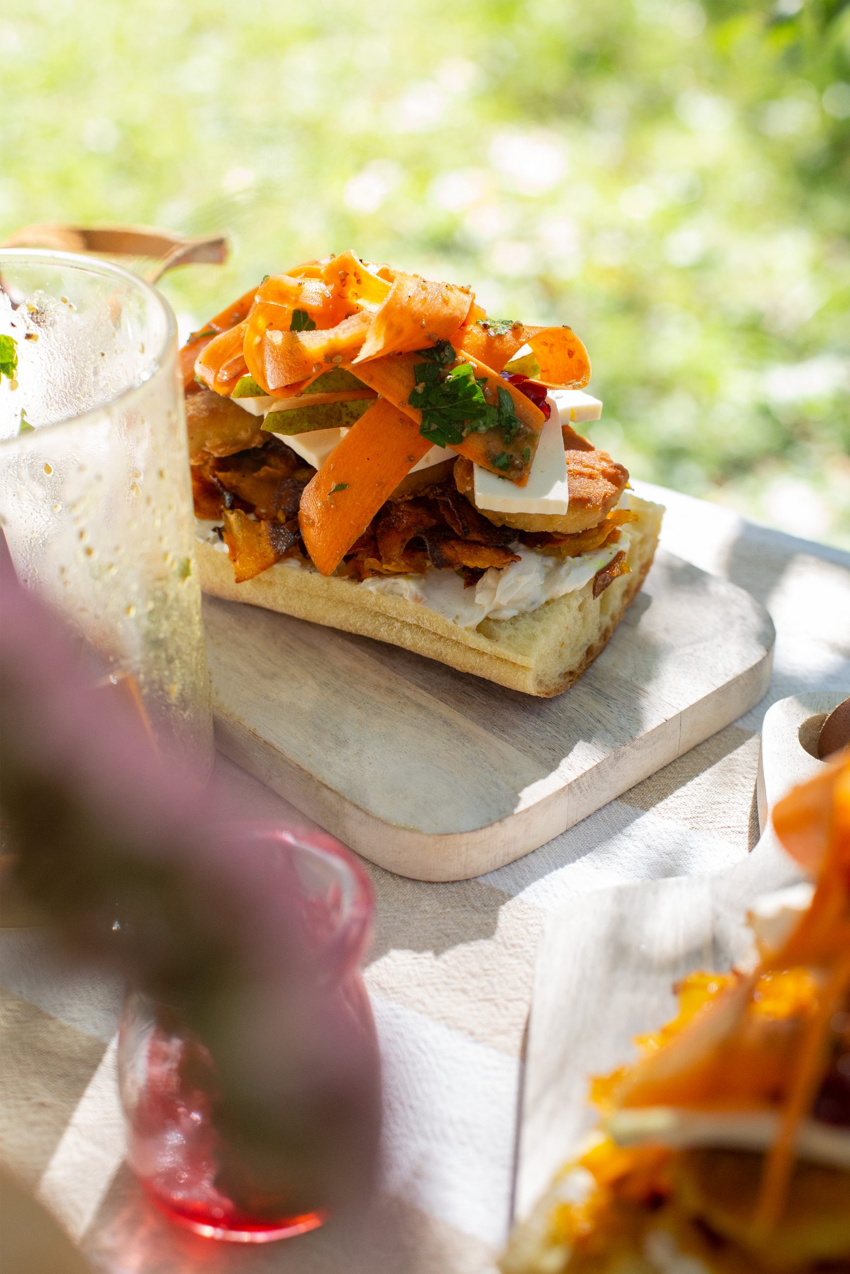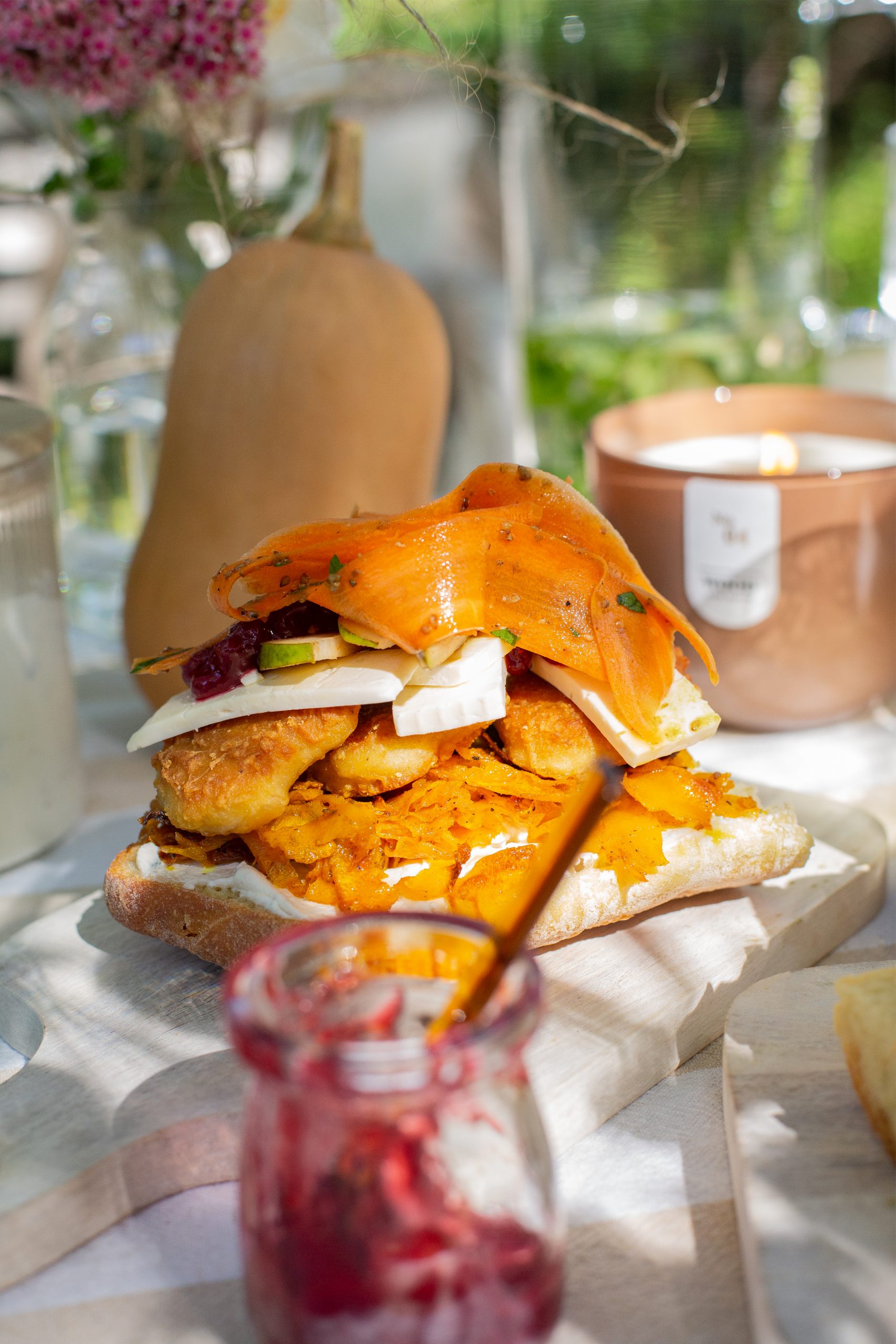Auf dem Sandwich sind noch weitere leckere Toppings, wie die marinierten Karottenstreifen. Habe dieses mal Kürbiskernöl benutzt, was super zum Herbst passt. Die veganen Nuggets, Feta, Birne und Preiselbeeren passen hervorragend zusammen.