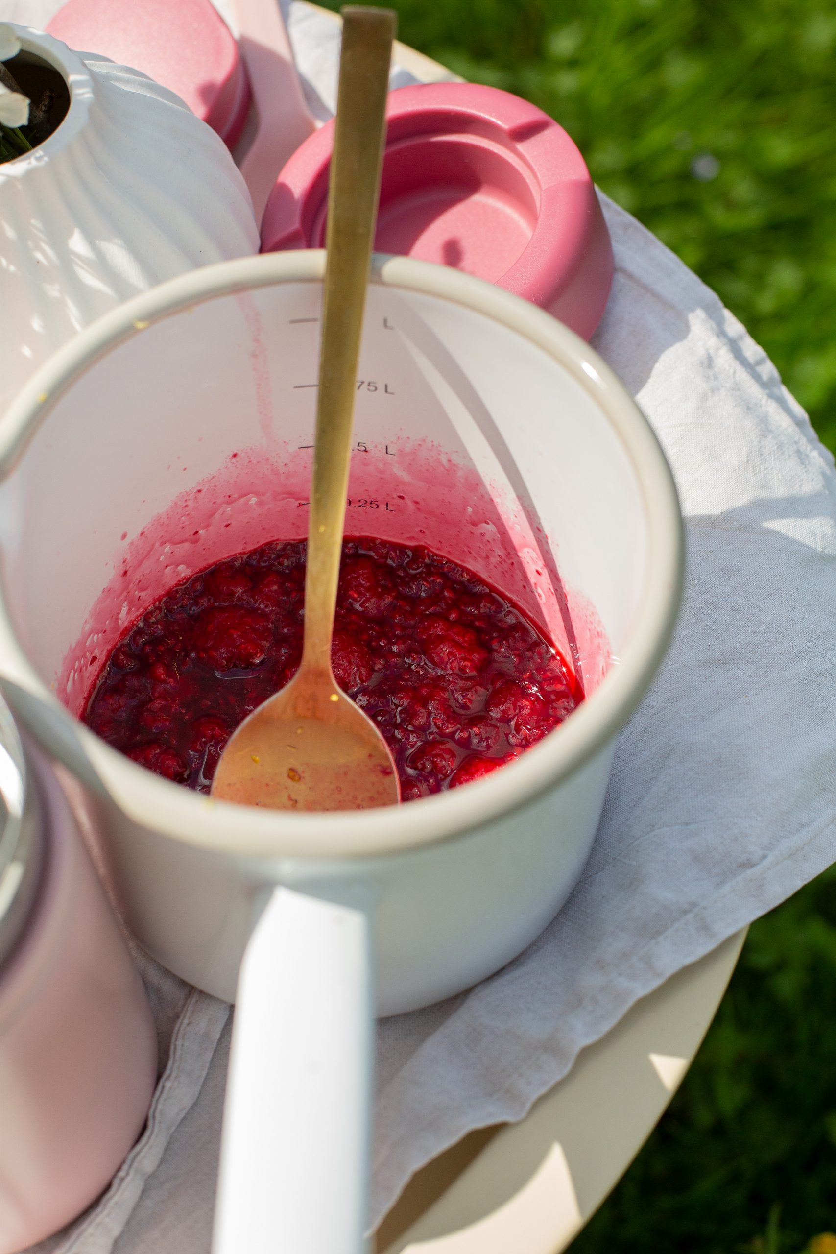 1. Die Himbeeren mit dem Zitronenabrieb und Ahornsirup erhitzen, aufkochen und auf niedriger Temperatur etwas einköcheln lassen. Dann zum Abkühlen zur Seite stellen.