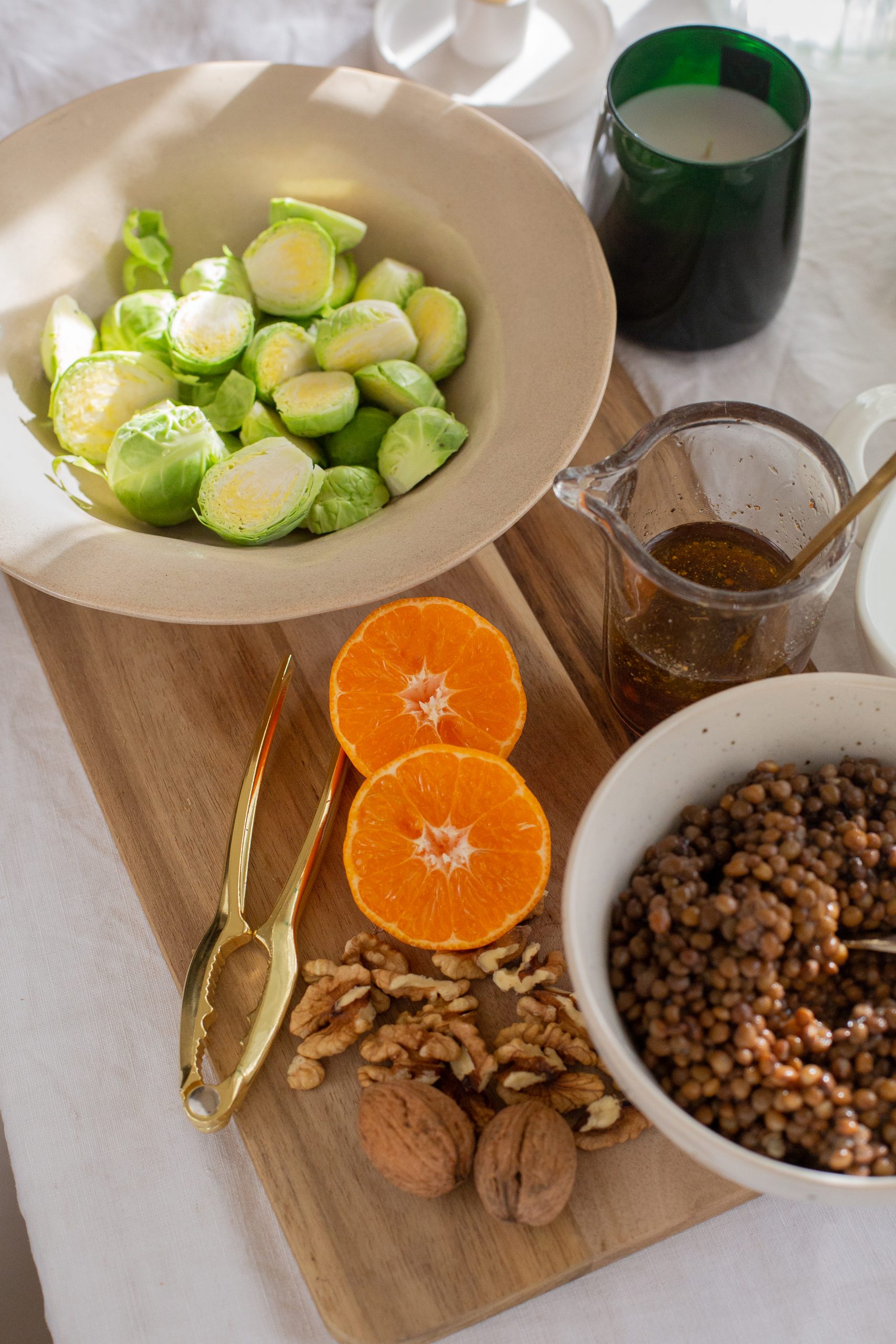 2. Den Rosenkohl putzen und halbieren. Linsen abgießen (ich gebe immer vorher etwas Wasser dazu und schütte dann alles über ein Sieb ab)