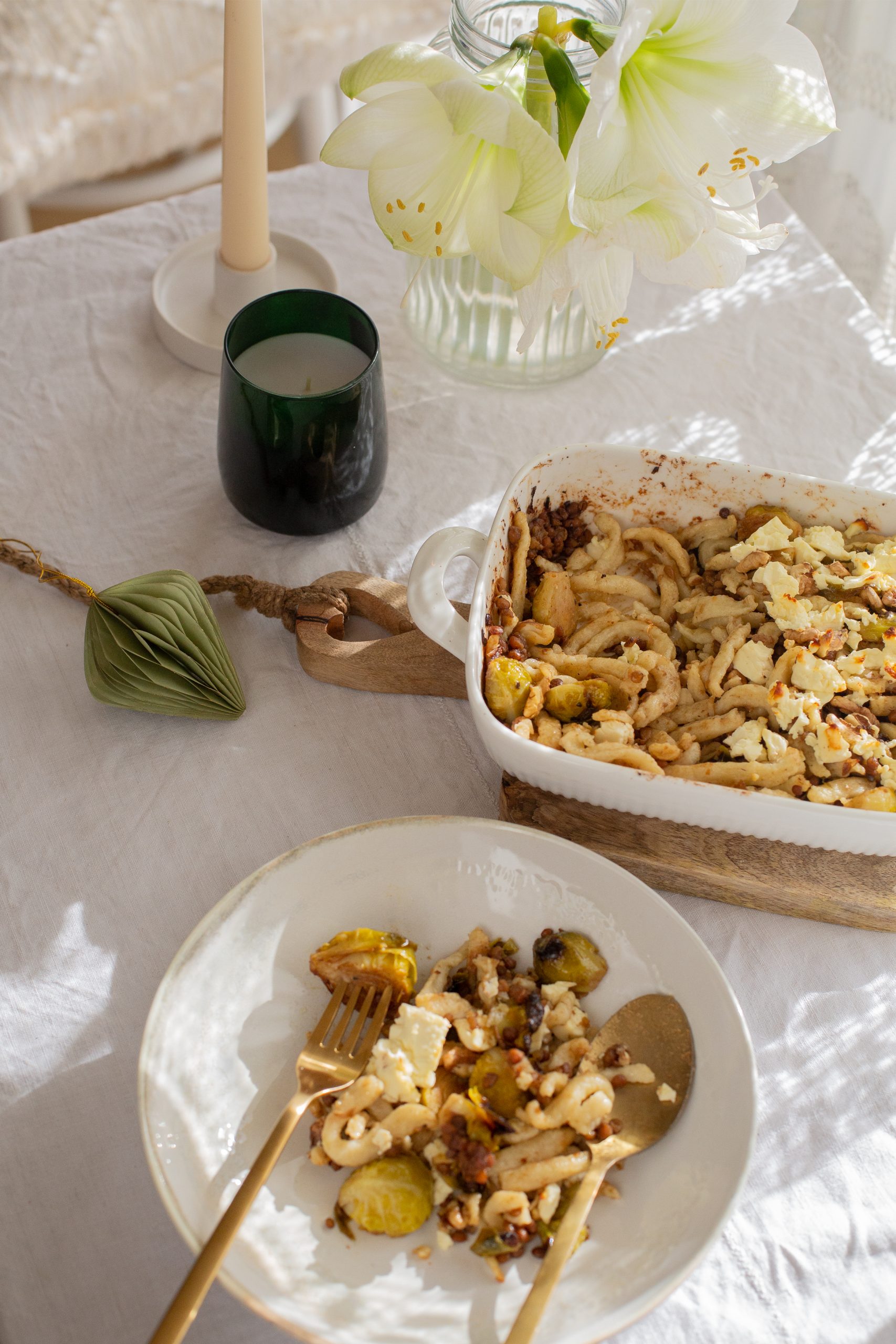 5. Spätzle dazugeben und vermengen. Darüber die klein gemachten Walnusskerne und klein gemachter Feta streuen. Für weitere 12 – 14 Minuten in den Ofen geben.