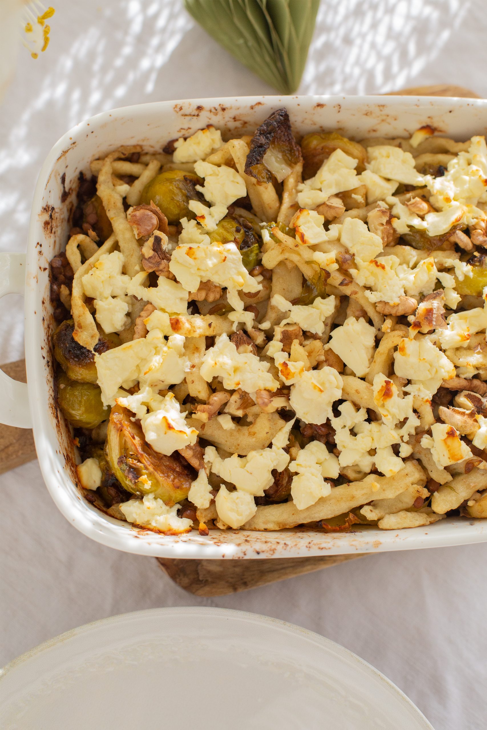 Die Linsen köcheln zusammen mit dem Rosenkohl in dem Sud und später kommen dann die Dunkelspätzle, Walnüsse und Feta (Hirtenkäse) dazu und werden darin noch mit gebacken.