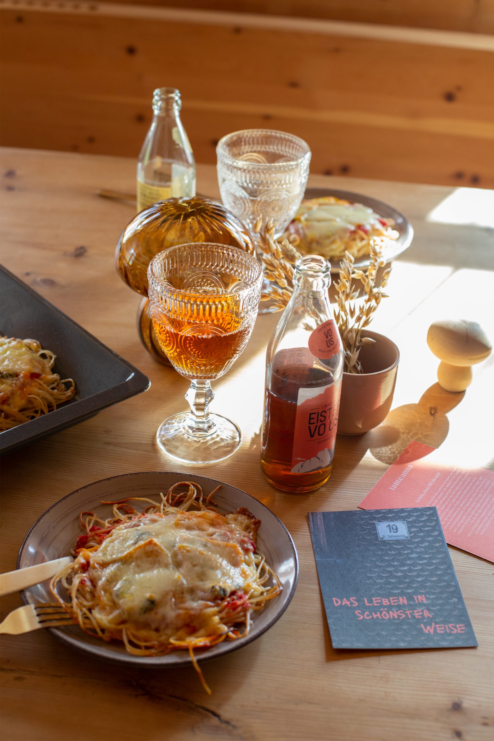 Morgens im Nebel losgefahren kamen wir bei schönstem Sonnenschein an und die Stube war in ein so schönes warmes Licht getaucht. Mit Blick auf die Berge kochten, lachten und genossen wir unsere Spaghettipizza.