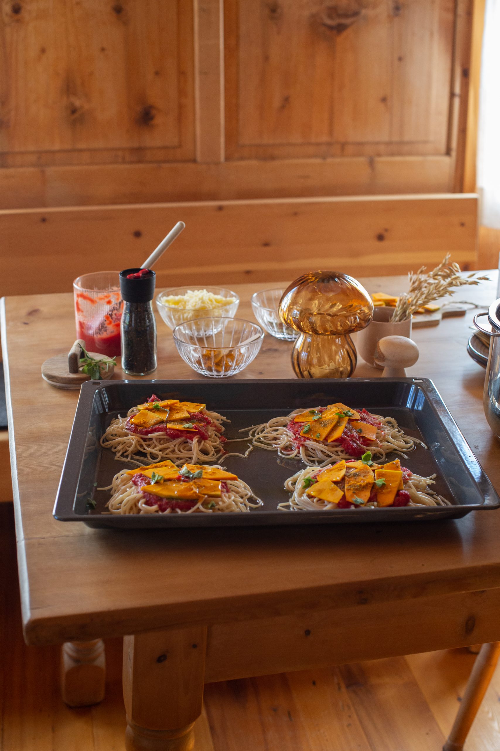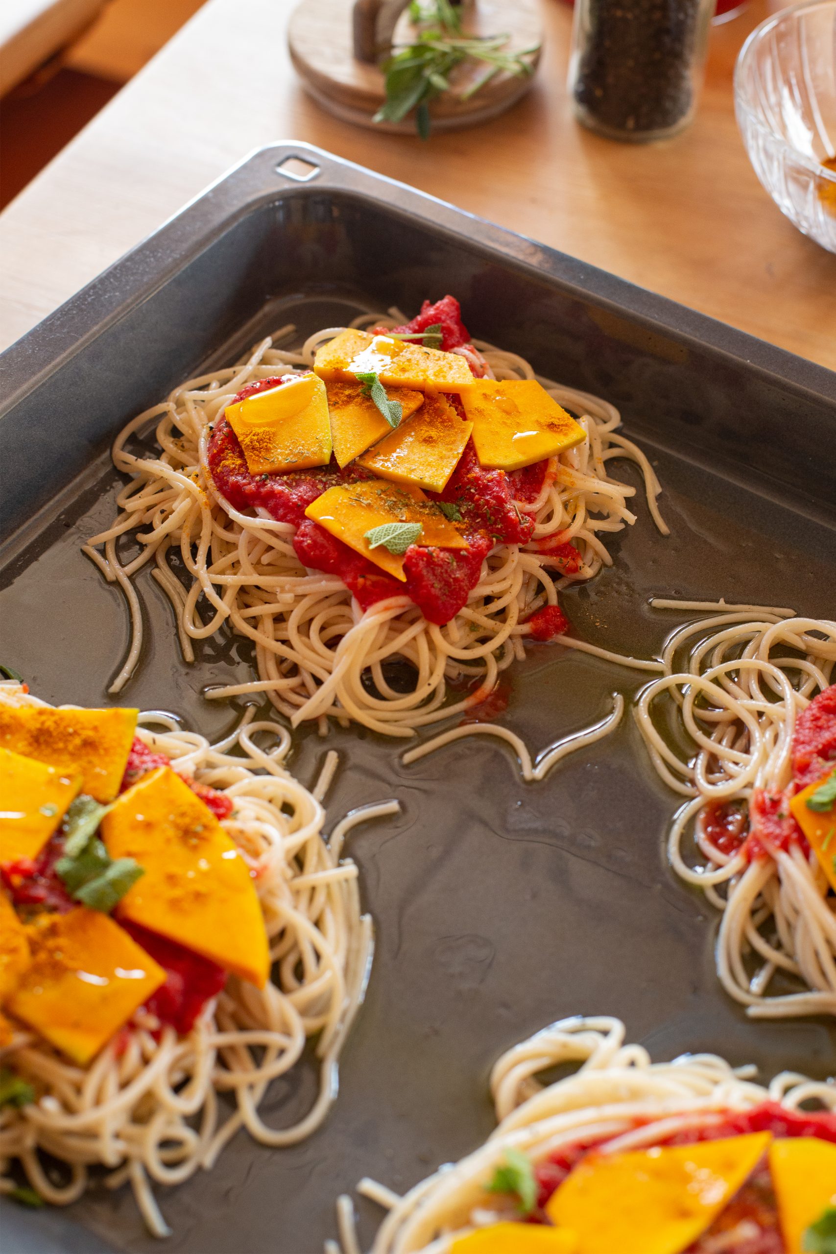 4. Die Spaghettis zu 4 kleine runde „Pizzen“ auf das Blech geben. Tomatensoße on top geben und mit etwas Kräutersalz und Pfeffer würzen. Kürbisstücke on top geben und diese mit Garam Masala und etwas Kräutersalz würzen. Ein Hauch Olivenöl darüber drizzeln.