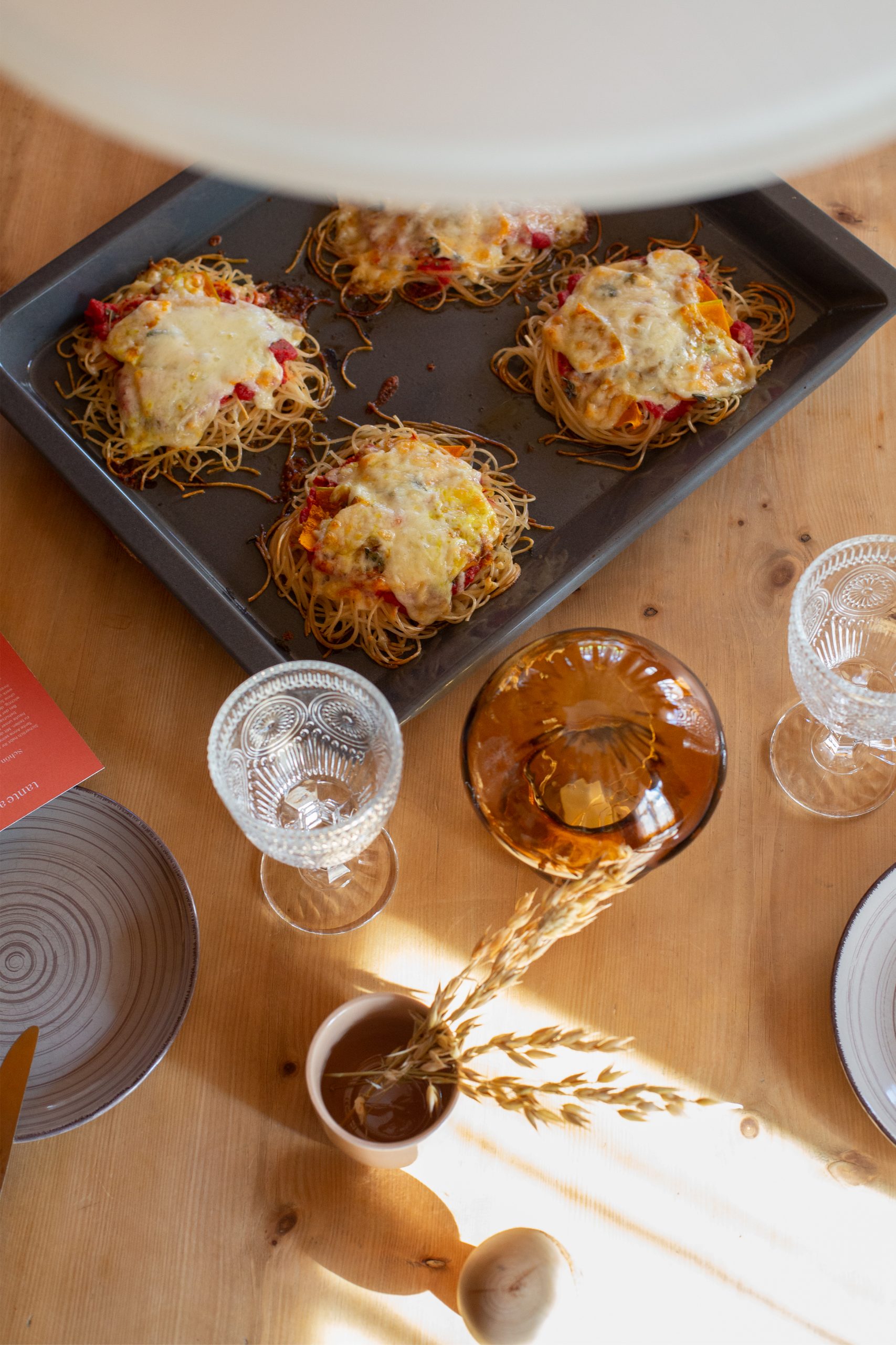Spaghettipizza ist ein Gericht aus meiner Kindheit und ich habe hier auch schon Mal eine sommerliche Variante euch vorgestellt und dieses Mal mit dem Kürbis herbstlich angehaucht. Die Spaghetti aus Emmer passen auch hervorragend in den Herbst durch das leicht nussige Aroma.
