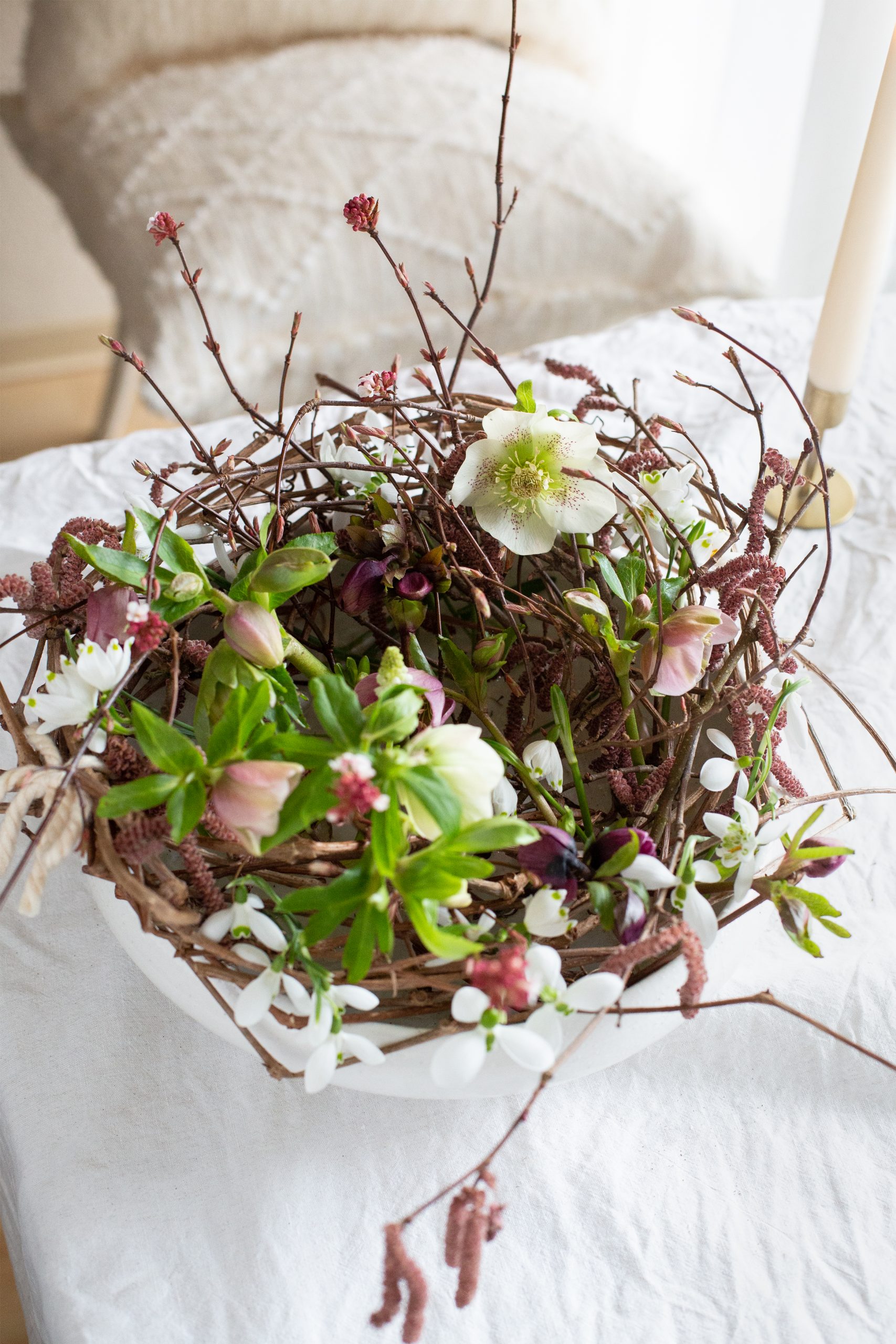 4. Jetzt kommen die Märzrosen dran, diese werden unten kreuzförmig eingeschnitten, so halten sie am längsten. In der Schale nach Belieben verteilen und zwischen den Zweigen „feststecken.“ Schon offene Blüten nach oben oder vorne hin ausrichten, so kommen sie wunderbar zur Geltung.