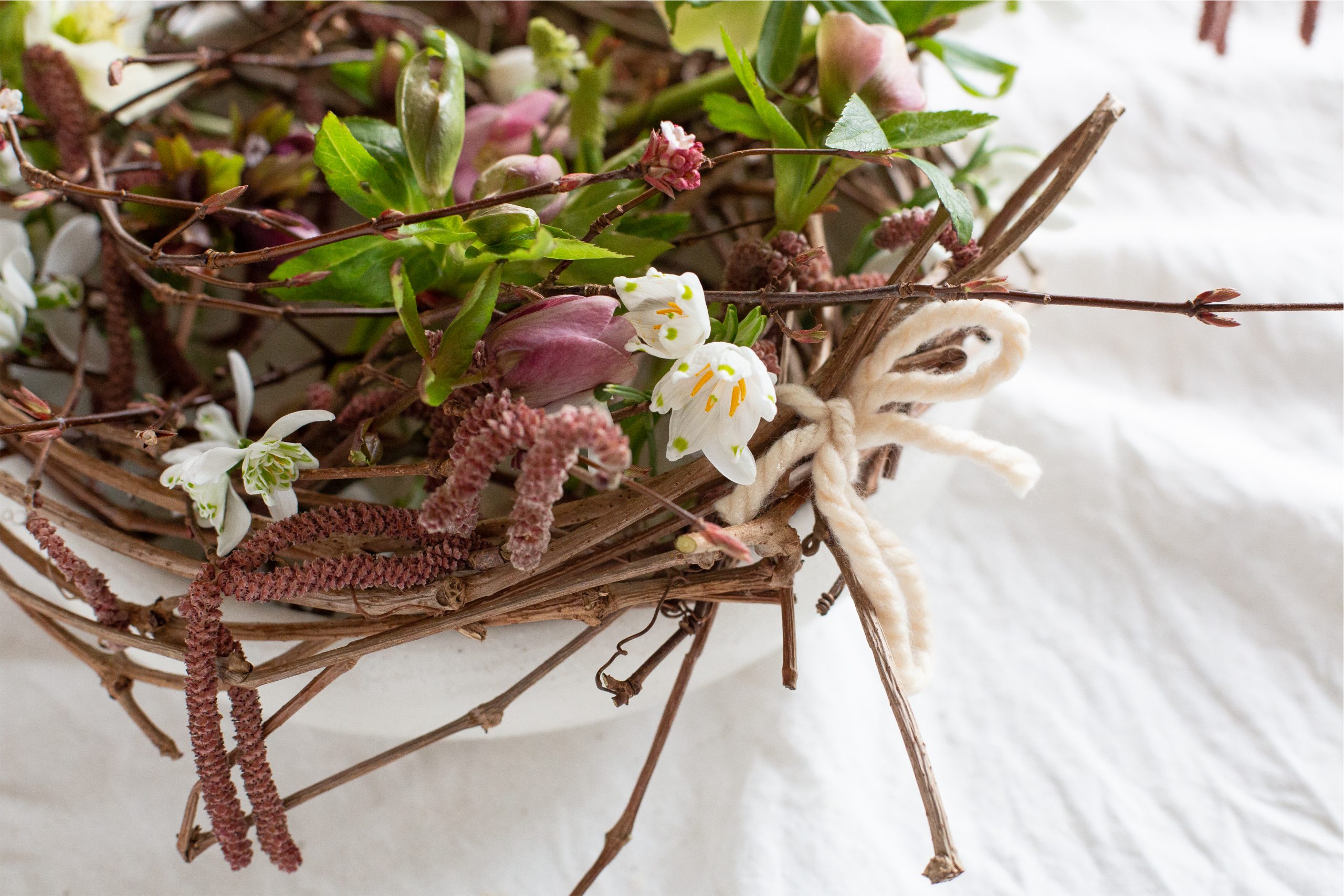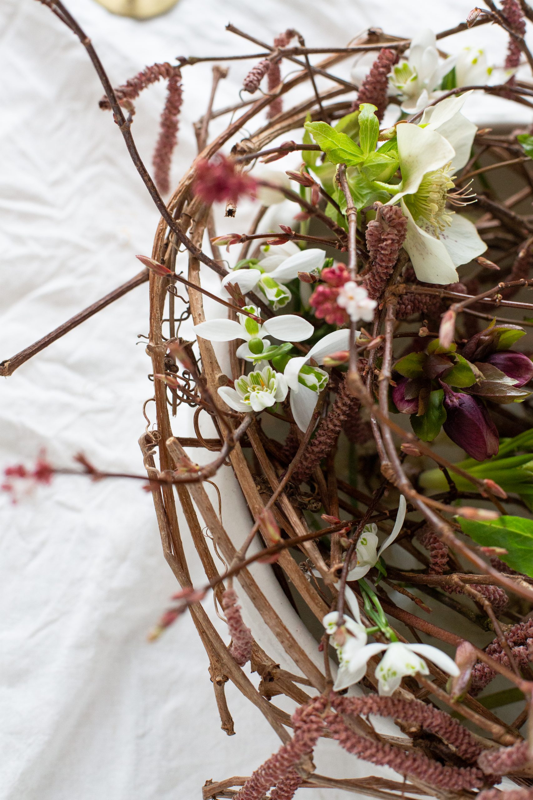5. Nun werden die Schneeglöckchen und Märzenbecher integriert. Auch gerne als kleine Sets. Die Enden vorher auch leicht schräg abschneiden für einen frischen Schnitt. Sowohl außen am Kranz als auch in die Mitte setzen, sodass verteilt kleine helle Highlights gesetzt sind.